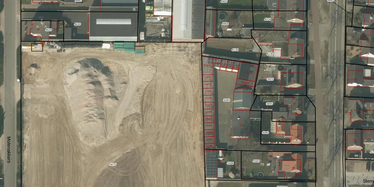 Het perceel waarop Molenakkers 4-r staat heeft een oppervlakte van 1,3 ha. Dit is een zeer groot perceel. De perceeloppervlakte wordt geregistreerd door het Kadaster. Gedetailleerde informatie over de maten van dit perceel kunt u vinden in het rapport Kadastrale kaart met maatvoering van Molenakkers 4-r.