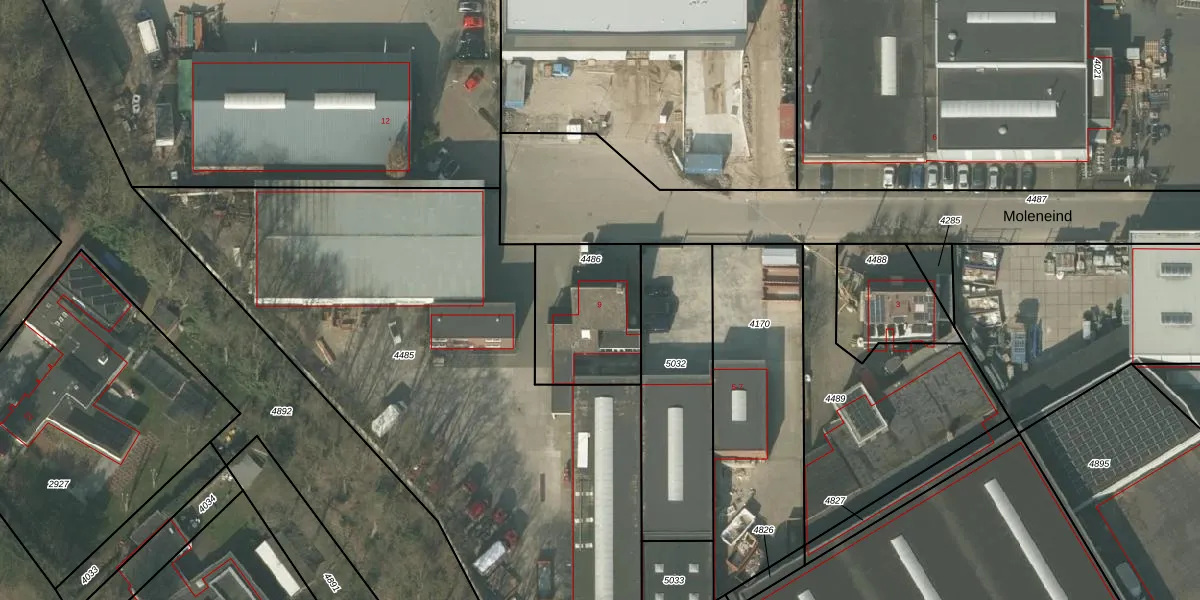 Moleneind 9 is gelegen op kadastraal perceel ATN01G4486. Deze kadastrale aanduiding is uniek en wordt gebruikt door het Kadaster om eigendomsrechten en andere zakelijke rechten vast te leggen. Het perceel maakt onderdeel uit van de kadastrale gemeente Asten.