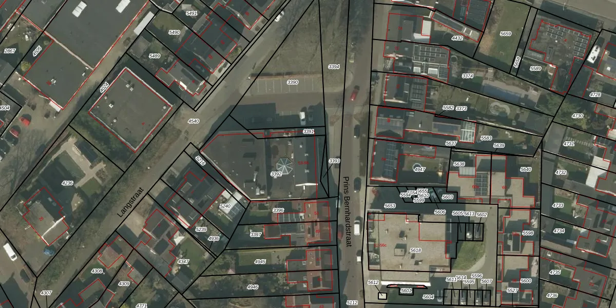 Het perceel waarop Prins Bernhardstraat 55 staat heeft een oppervlakte van 739 m². Dit is een groot perceel. De perceeloppervlakte wordt geregistreerd door het Kadaster. Gedetailleerde informatie over de maten van dit perceel kunt u vinden in het rapport Kadastrale kaart met maatvoering van Prins Bernhardstraat 55.