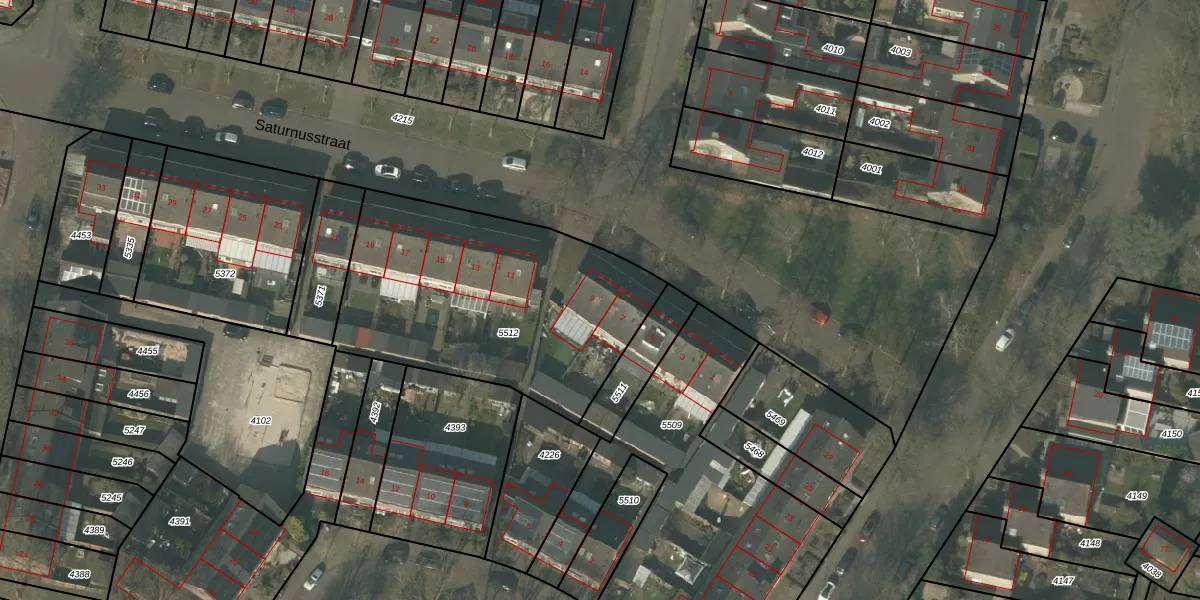 Het perceel waarop Saturnusstraat 9 staat heeft een oppervlakte van 1336 m². Dit is een zeer groot perceel. De perceeloppervlakte wordt geregistreerd door het Kadaster. Gedetailleerde informatie over de maten van dit perceel kunt u vinden in het rapport Kadastrale kaart met maatvoering van Saturnusstraat 9.