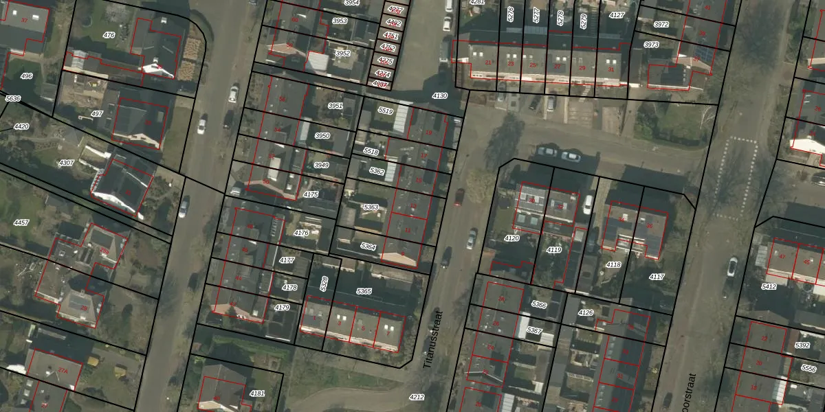 Titanusstraat 13 is gelegen op kadastraal perceel ATN01C5363. Deze kadastrale aanduiding is uniek en wordt gebruikt door het Kadaster om eigendomsrechten en andere zakelijke rechten vast te leggen. Het perceel maakt onderdeel uit van de kadastrale gemeente Asten.