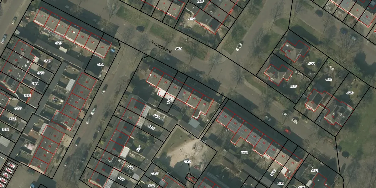 Het perceel waarop Venusstraat 22 staat heeft een oppervlakte van 1250 m². Dit is een zeer groot perceel. De perceeloppervlakte wordt geregistreerd door het Kadaster. Gedetailleerde informatie over de maten van dit perceel kunt u vinden in het rapport Kadastrale kaart met maatvoering van Venusstraat 22.