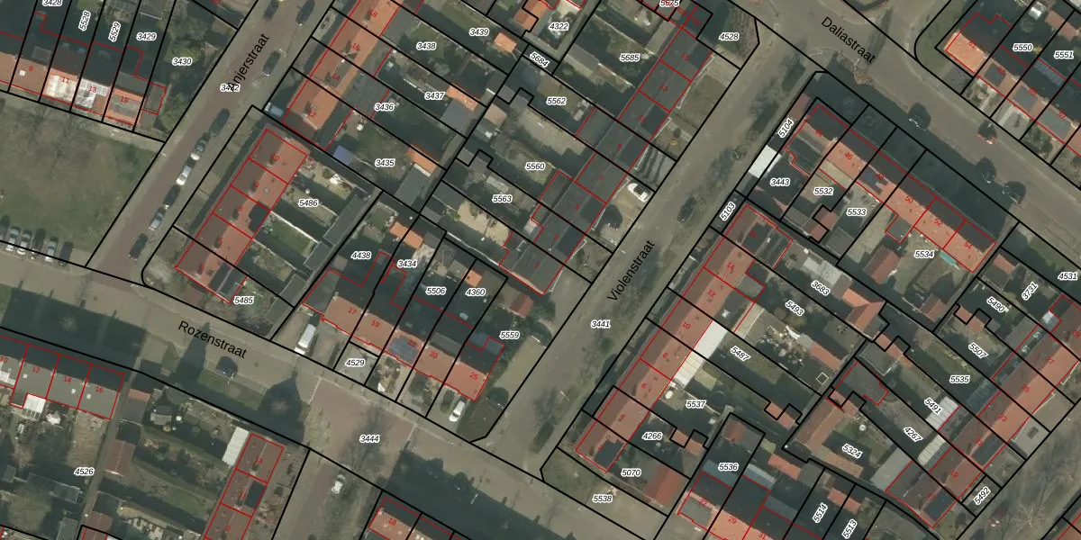 Het perceel waarop Violenstraat 1 staat heeft een oppervlakte van 646 m². Dit is een groot perceel. De perceeloppervlakte wordt geregistreerd door het Kadaster. Gedetailleerde informatie over de maten van dit perceel kunt u vinden in het rapport Kadastrale kaart met maatvoering van Violenstraat 1.