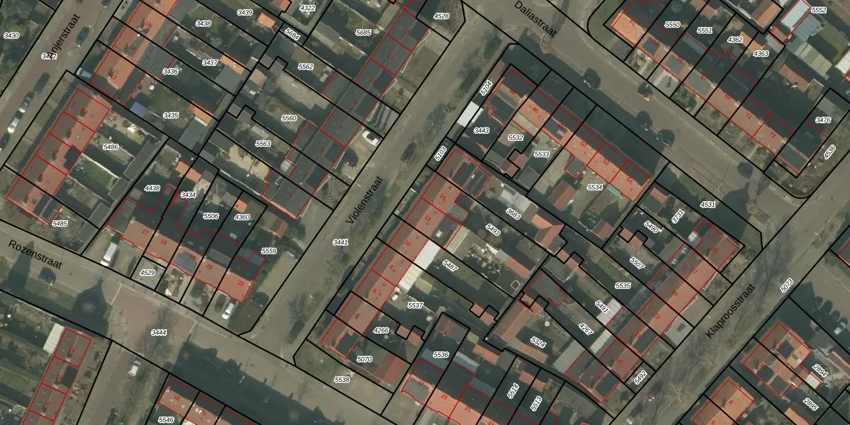 Het perceel waarop Violenstraat 12 staat heeft een oppervlakte van 485 m². Dit is een groot perceel. De perceeloppervlakte wordt geregistreerd door het Kadaster. Gedetailleerde informatie over de maten van dit perceel kunt u vinden in het rapport Kadastrale kaart met maatvoering van Violenstraat 12.