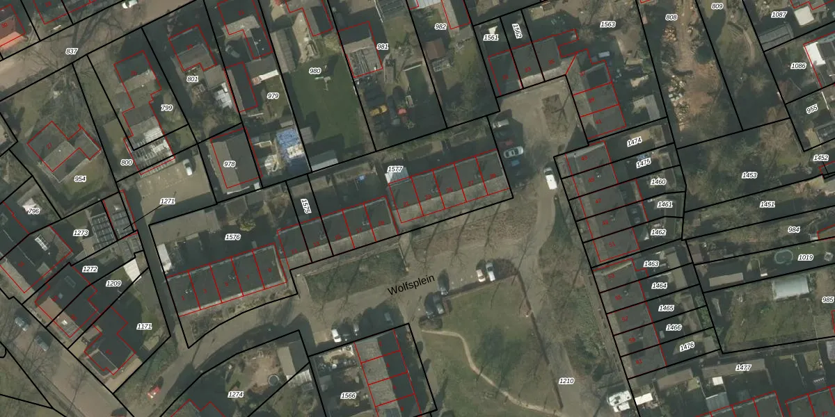 Het perceel waarop Wolfsplein 21 staat heeft een oppervlakte van 942 m². Dit is een groot perceel. De perceeloppervlakte wordt geregistreerd door het Kadaster. Gedetailleerde informatie over de maten van dit perceel kunt u vinden in het rapport Kadastrale kaart met maatvoering van Wolfsplein 21.