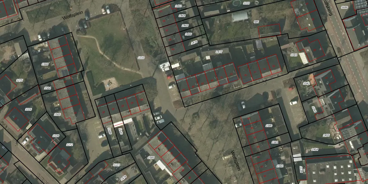 Het perceel waarop Wolfsplein 63 staat heeft een oppervlakte van 1555 m². Dit is een zeer groot perceel. De perceeloppervlakte wordt geregistreerd door het Kadaster. Gedetailleerde informatie over de maten van dit perceel kunt u vinden in het rapport Kadastrale kaart met maatvoering van Wolfsplein 63.
