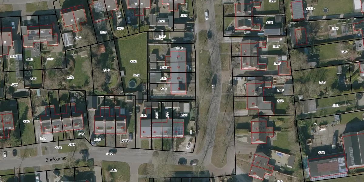 Het perceel waarop Boskkamp 36 staat heeft een oppervlakte van 227 m². Dit is een middelgroot perceel. De perceeloppervlakte wordt geregistreerd door het Kadaster. Gedetailleerde informatie over de maten van dit perceel kunt u vinden in het rapport Kadastrale kaart met maatvoering van Boskkamp 36.