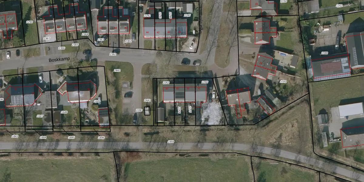 Het perceel waarop Boskkamp 45 staat heeft een oppervlakte van 152 m². Dit is een middelgroot perceel. De perceeloppervlakte wordt geregistreerd door het Kadaster. Gedetailleerde informatie over de maten van dit perceel kunt u vinden in het rapport Kadastrale kaart met maatvoering van Boskkamp 45.