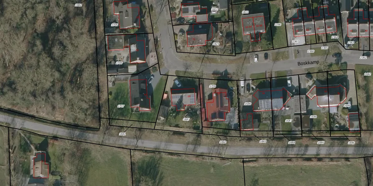 Het perceel waarop Boskkamp 59 staat heeft een oppervlakte van 642 m². Dit is een groot perceel. De perceeloppervlakte wordt geregistreerd door het Kadaster. Gedetailleerde informatie over de maten van dit perceel kunt u vinden in het rapport Kadastrale kaart met maatvoering van Boskkamp 59.