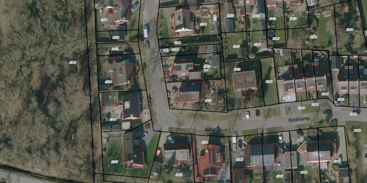 Het perceel waarop Boskkamp 70 staat heeft een oppervlakte van 523 m². Dit is een groot perceel. De perceeloppervlakte wordt geregistreerd door het Kadaster. Gedetailleerde informatie over de maten van dit perceel kunt u vinden in het rapport Kadastrale kaart met maatvoering van Boskkamp 70.