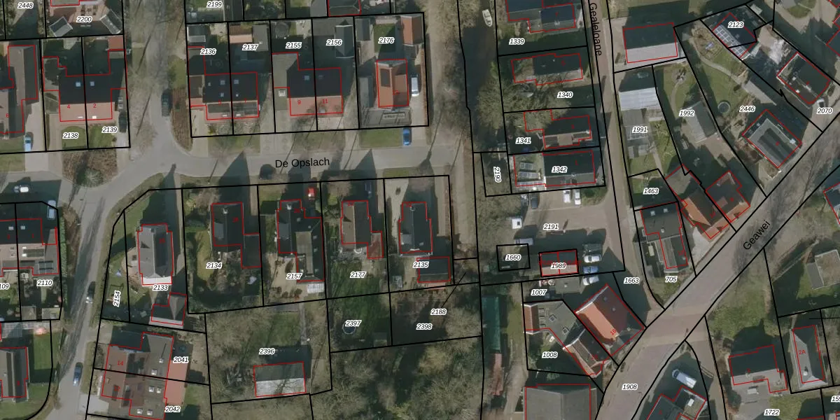 Het perceel waarop De Opslach 24 staat heeft een oppervlakte van 414 m². Dit is een groot perceel. De perceeloppervlakte wordt geregistreerd door het Kadaster. Gedetailleerde informatie over de maten van dit perceel kunt u vinden in het rapport Kadastrale kaart met maatvoering van De Opslach 24.
