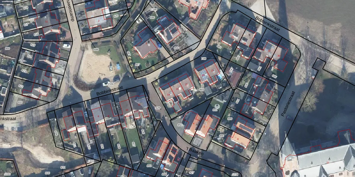 Het perceel waarop Bobbinkstraat 16 staat heeft een oppervlakte van 855 m². Dit is een groot perceel. De perceeloppervlakte wordt geregistreerd door het Kadaster. Gedetailleerde informatie over de maten van dit perceel kunt u vinden in het rapport Kadastrale kaart met maatvoering van Bobbinkstraat 16.