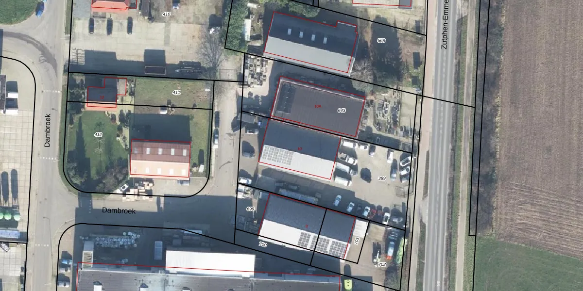 Dambroek 10 is gelegen op kadastraal perceel SDR00W389. Deze kadastrale aanduiding is uniek en wordt gebruikt door het Kadaster om eigendomsrechten en andere zakelijke rechten vast te leggen. Het perceel maakt onderdeel uit van de kadastrale gemeente Steenderen.
