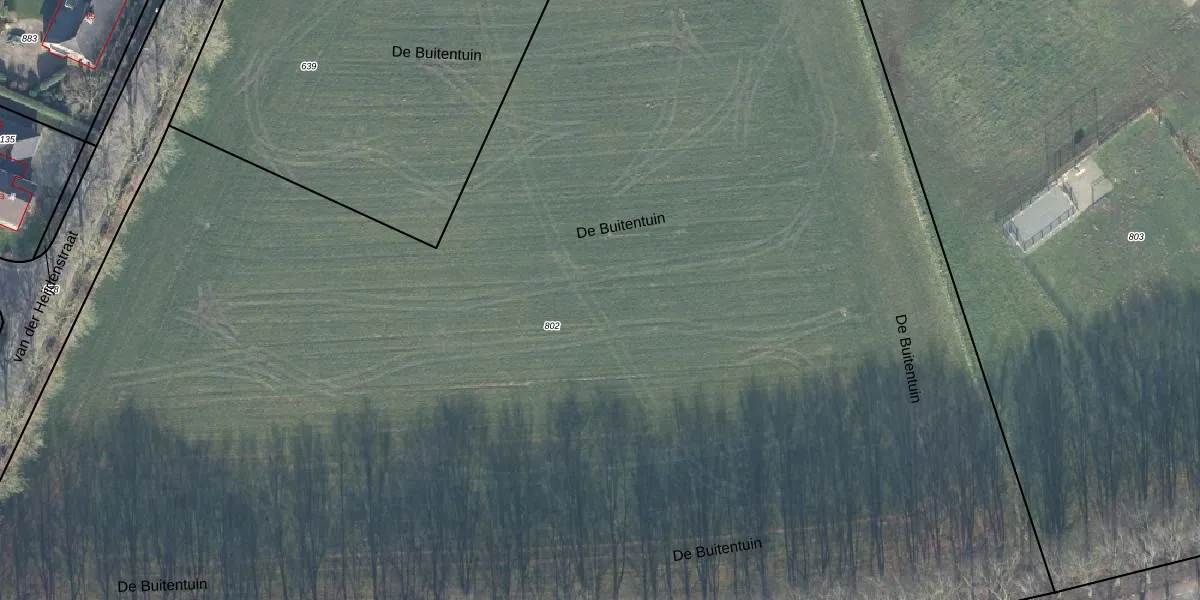Het perceel waarop De Buitentuin 39 staat heeft een oppervlakte van 1,5 ha. Dit is een zeer groot perceel. De perceeloppervlakte wordt geregistreerd door het Kadaster. Gedetailleerde informatie over de maten van dit perceel kunt u vinden in het rapport Kadastrale kaart met maatvoering van De Buitentuin 39.