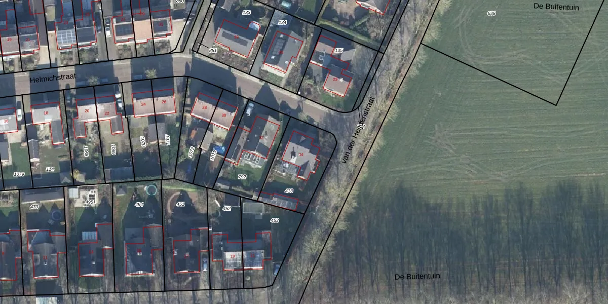 Het perceel waarop Helmichstraat 34 staat heeft een oppervlakte van 490 m². Dit is een groot perceel. De perceeloppervlakte wordt geregistreerd door het Kadaster. Gedetailleerde informatie over de maten van dit perceel kunt u vinden in het rapport Kadastrale kaart met maatvoering van Helmichstraat 34.