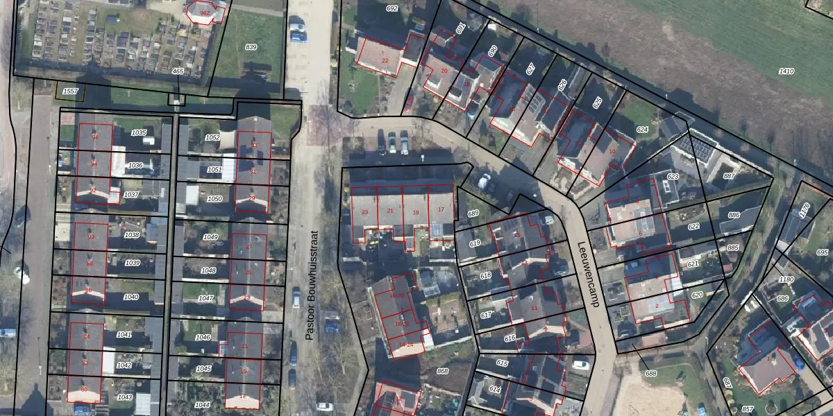 Het perceel waarop Leeuwencamp 19 staat heeft een oppervlakte van 2230 m². Dit is een zeer groot perceel. De perceeloppervlakte wordt geregistreerd door het Kadaster. Gedetailleerde informatie over de maten van dit perceel kunt u vinden in het rapport Kadastrale kaart met maatvoering van Leeuwencamp 19.