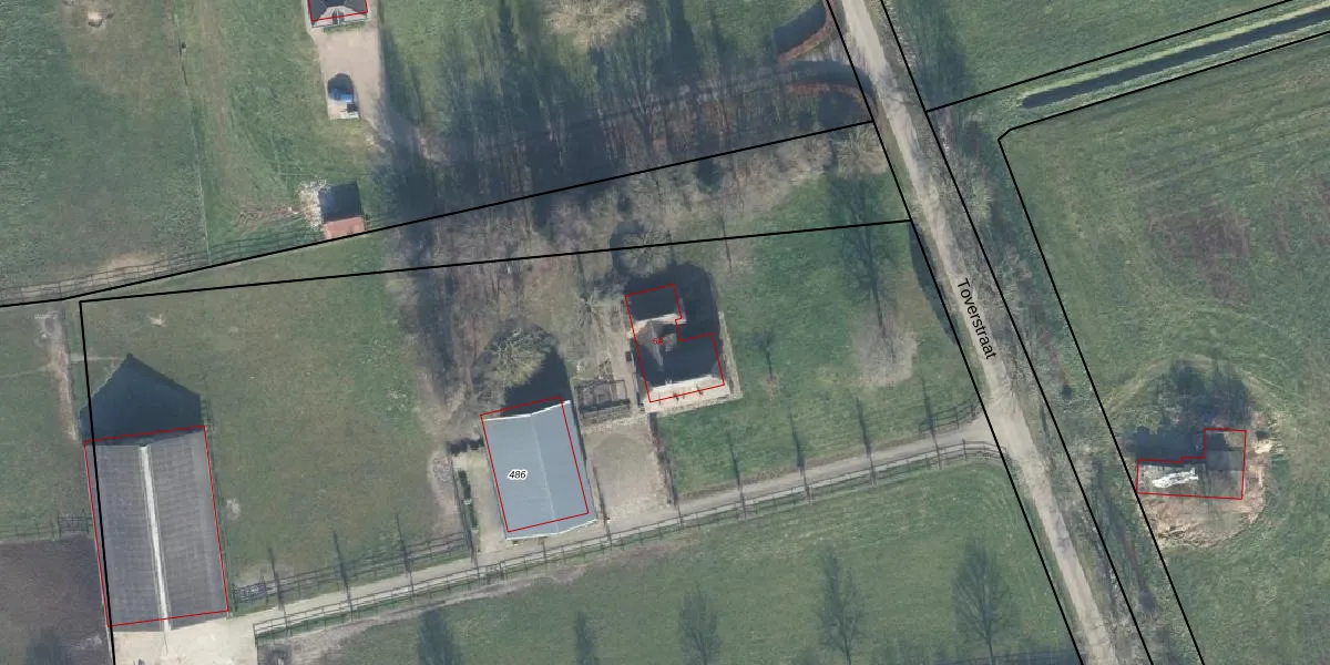 Het perceel waarop Toverstraat 6-A staat heeft een oppervlakte van 1,0 ha. Dit is een zeer groot perceel. De perceeloppervlakte wordt geregistreerd door het Kadaster. Gedetailleerde informatie over de maten van dit perceel kunt u vinden in het rapport Kadastrale kaart met maatvoering van Toverstraat 6-A.