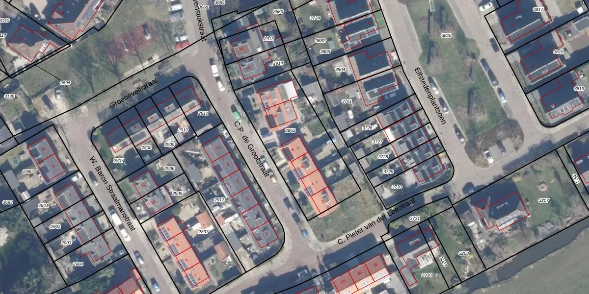 Het perceel waarop C.P. de Grootstraat 8 staat heeft een oppervlakte van 1030 m². Dit is een zeer groot perceel. De perceeloppervlakte wordt geregistreerd door het Kadaster. Gedetailleerde informatie over de maten van dit perceel kunt u vinden in het rapport Kadastrale kaart met maatvoering van C.P. de Grootstraat 8.