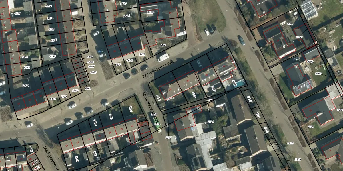 Het perceel waarop Korenbloemstraat 24 staat heeft een oppervlakte van 341 m². Dit is een groot perceel. De perceeloppervlakte wordt geregistreerd door het Kadaster. Gedetailleerde informatie over de maten van dit perceel kunt u vinden in het rapport Kadastrale kaart met maatvoering van Korenbloemstraat 24.