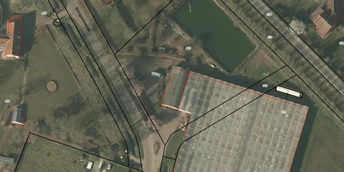 Het perceel waarop Bongardweide 16 staat heeft een oppervlakte van 4815 m². Dit is een zeer groot perceel. De perceeloppervlakte wordt geregistreerd door het Kadaster. Gedetailleerde informatie over de maten van dit perceel kunt u vinden in het rapport Kadastrale kaart met maatvoering van Bongardweide 16.