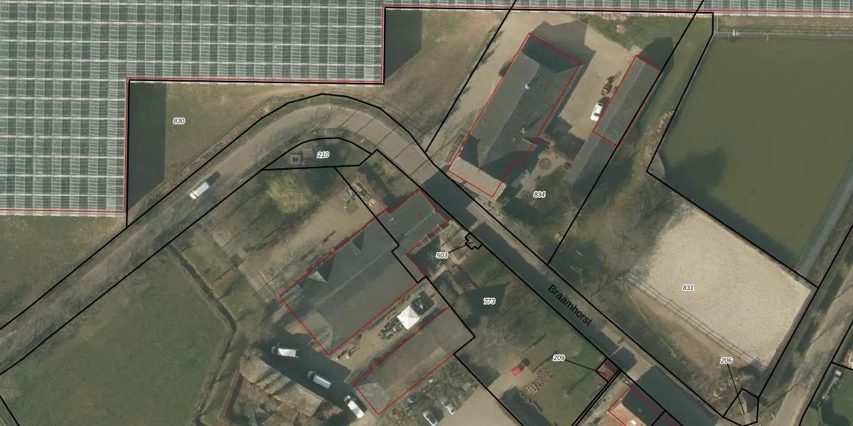Braamhorst 1 is gelegen op kadastraal perceel MBE00L773. Deze kadastrale aanduiding is uniek en wordt gebruikt door het Kadaster om eigendomsrechten en andere zakelijke rechten vast te leggen. Het perceel maakt onderdeel uit van de kadastrale gemeente Maasbree.