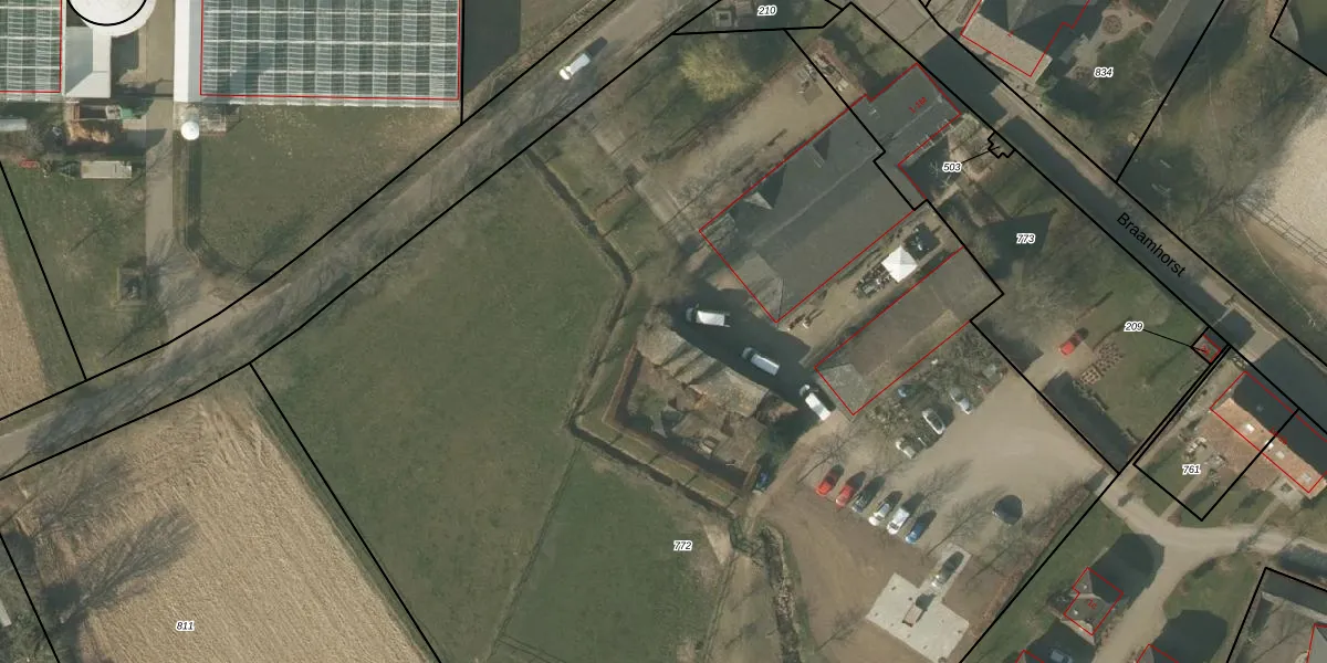 Het perceel waarop Braamhorst 1-K staat heeft een oppervlakte van 1,2 ha. Dit is een zeer groot perceel. De perceeloppervlakte wordt geregistreerd door het Kadaster. Gedetailleerde informatie over de maten van dit perceel kunt u vinden in het rapport Kadastrale kaart met maatvoering van Braamhorst 1-K.