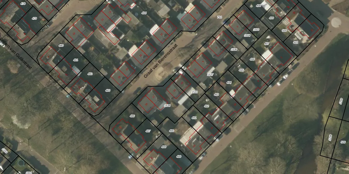 Het perceel waarop Graaf van Bierensstraat 15 staat heeft een oppervlakte van 560 m². Dit is een groot perceel. De perceeloppervlakte wordt geregistreerd door het Kadaster. Gedetailleerde informatie over de maten van dit perceel kunt u vinden in het rapport Kadastrale kaart met maatvoering van Graaf van Bierensstraat 15.