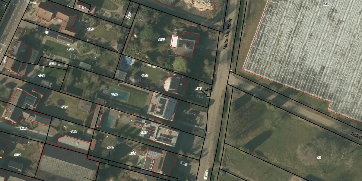 Middelste Horst 13 is gelegen op kadastraal perceel MBE00C4852. Deze kadastrale aanduiding is uniek en wordt gebruikt door het Kadaster om eigendomsrechten en andere zakelijke rechten vast te leggen. Het perceel maakt onderdeel uit van de kadastrale gemeente Maasbree.