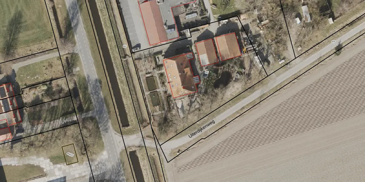 Het perceel waarop Uiterdijkenweg 59 staat heeft een oppervlakte van 2960 m². Dit is een zeer groot perceel. De perceeloppervlakte wordt geregistreerd door het Kadaster. Gedetailleerde informatie over de maten van dit perceel kunt u vinden in het rapport Kadastrale kaart met maatvoering van Uiterdijkenweg 59.