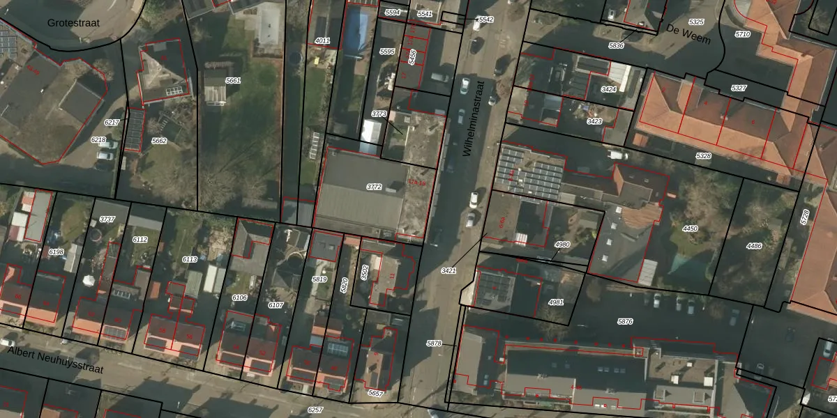 Het perceel waarop Wilhelminastraat 15 staat heeft een oppervlakte van 555 m². Dit is een groot perceel. De perceeloppervlakte wordt geregistreerd door het Kadaster. Gedetailleerde informatie over de maten van dit perceel kunt u vinden in het rapport Kadastrale kaart met maatvoering van Wilhelminastraat 15.