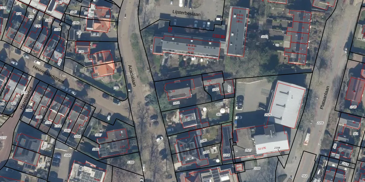 Gebruik de zoekbalk of klik op een perceel voor informatie over de adressen binnen dit perceel.