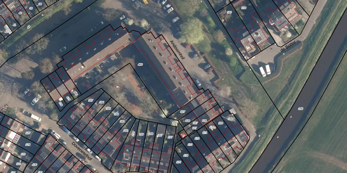 Het perceel waarop Andoornhof 36 staat heeft een oppervlakte van 2111 m². Dit is een zeer groot perceel. De perceeloppervlakte wordt geregistreerd door het Kadaster. Gedetailleerde informatie over de maten van dit perceel kunt u vinden in het rapport Kadastrale kaart met maatvoering van Andoornhof 36.