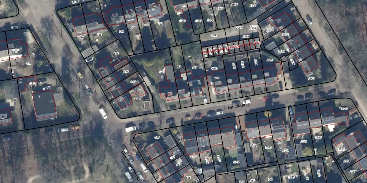 Bachlaan 16 is gelegen op kadastraal perceel BAA01H650. Deze kadastrale aanduiding is uniek en wordt gebruikt door het Kadaster om eigendomsrechten en andere zakelijke rechten vast te leggen. Het perceel maakt onderdeel uit van de kadastrale gemeente Baarn.