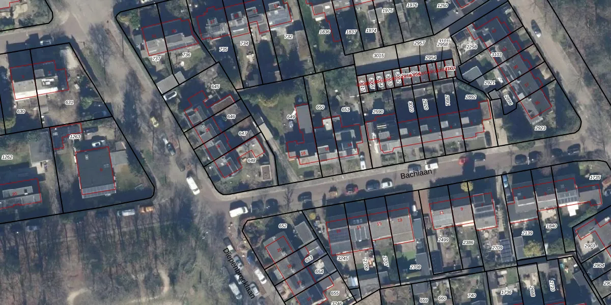 Het perceel waarop Bachlaan 18 staat heeft een oppervlakte van 585 m². Dit is een groot perceel. De perceeloppervlakte wordt geregistreerd door het Kadaster. Gedetailleerde informatie over de maten van dit perceel kunt u vinden in het rapport Kadastrale kaart met maatvoering van Bachlaan 18.