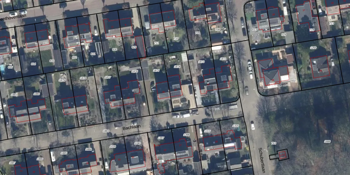 Het perceel waarop Bachlaan 44 staat heeft een oppervlakte van 457 m². Dit is een groot perceel. De perceeloppervlakte wordt geregistreerd door het Kadaster. Gedetailleerde informatie over de maten van dit perceel kunt u vinden in het rapport Kadastrale kaart met maatvoering van Bachlaan 44.