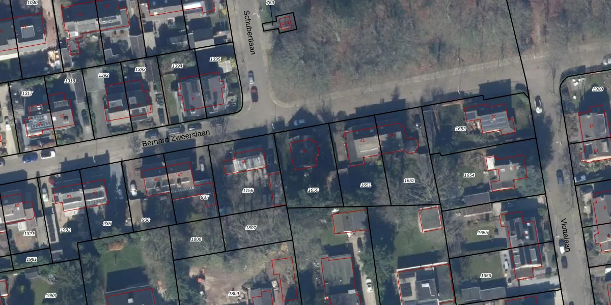 Het perceel waarop Bernard Zweerslaan 43 staat heeft een oppervlakte van 470 m². Dit is een groot perceel. De perceeloppervlakte wordt geregistreerd door het Kadaster. Gedetailleerde informatie over de maten van dit perceel kunt u vinden in het rapport Kadastrale kaart met maatvoering van Bernard Zweerslaan 43.