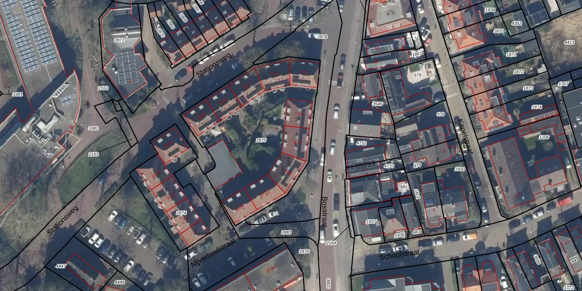 Het perceel waarop Bosstraat 12 staat heeft een oppervlakte van 1721 m². Dit is een zeer groot perceel. De perceeloppervlakte wordt geregistreerd door het Kadaster. Gedetailleerde informatie over de maten van dit perceel kunt u vinden in het rapport Kadastrale kaart met maatvoering van Bosstraat 12.