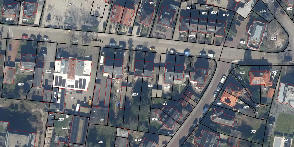 Het perceel waarop Dalweg 24 staat heeft een oppervlakte van 502 m². Dit is een groot perceel. De perceeloppervlakte wordt geregistreerd door het Kadaster. Gedetailleerde informatie over de maten van dit perceel kunt u vinden in het rapport Kadastrale kaart met maatvoering van Dalweg 24.
