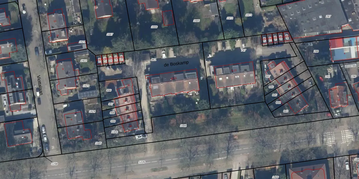 Het perceel waarop de Boskamp 19 staat heeft een oppervlakte van 1713 m². Dit is een zeer groot perceel. De perceeloppervlakte wordt geregistreerd door het Kadaster. Gedetailleerde informatie over de maten van dit perceel kunt u vinden in het rapport Kadastrale kaart met maatvoering van de Boskamp 19.