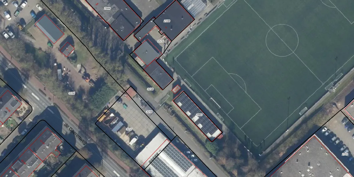 Het perceel waarop de Geerenweg 2-T1 staat heeft een oppervlakte van 7,5 ha. Dit is een zeer groot perceel. De perceeloppervlakte wordt geregistreerd door het Kadaster. Gedetailleerde informatie over de maten van dit perceel kunt u vinden in het rapport Kadastrale kaart met maatvoering van de Geerenweg 2-T1.