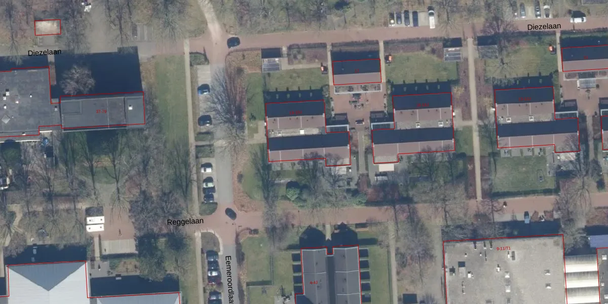 Het perceel waarop Diezelaan 19-B staat heeft een oppervlakte van 24,2 ha. Dit is een zeer groot perceel. De perceeloppervlakte wordt geregistreerd door het Kadaster. Gedetailleerde informatie over de maten van dit perceel kunt u vinden in het rapport Kadastrale kaart met maatvoering van Diezelaan 19-B.