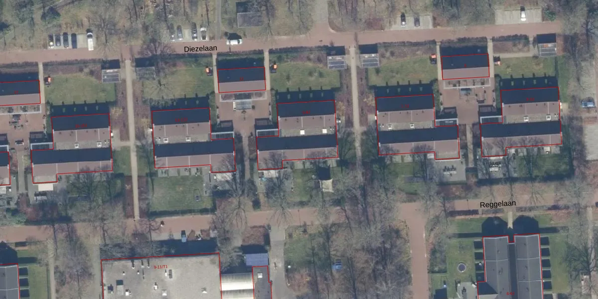 Het perceel waarop Diezelaan 9-B staat heeft een oppervlakte van 24,2 ha. Dit is een zeer groot perceel. De perceeloppervlakte wordt geregistreerd door het Kadaster. Gedetailleerde informatie over de maten van dit perceel kunt u vinden in het rapport Kadastrale kaart met maatvoering van Diezelaan 9-B.