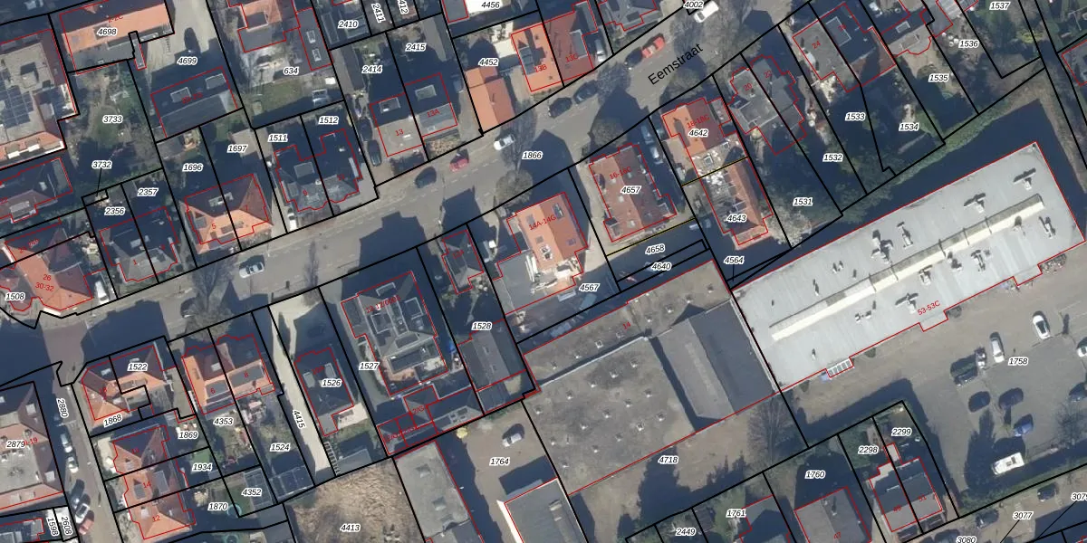 Het perceel waarop Eemstraat 14-E staat heeft een oppervlakte van 517 m². Dit is een groot perceel. De perceeloppervlakte wordt geregistreerd door het Kadaster. Gedetailleerde informatie over de maten van dit perceel kunt u vinden in het rapport Kadastrale kaart met maatvoering van Eemstraat 14-E.