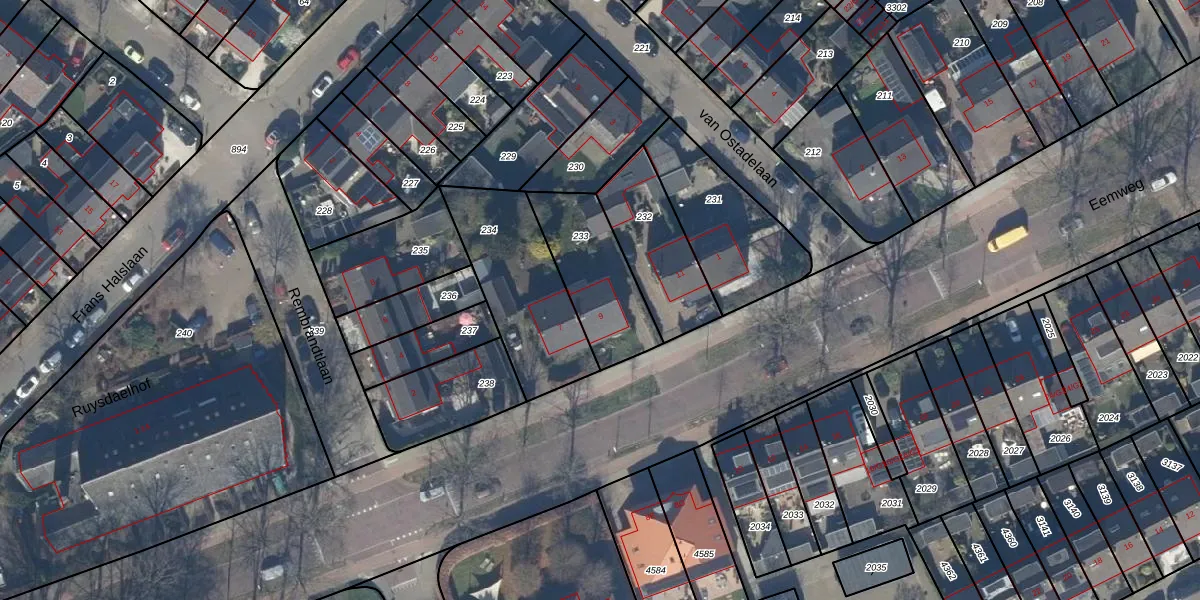 Eemweg 9 is gelegen op kadastraal perceel BAA01H233. Deze kadastrale aanduiding is uniek en wordt gebruikt door het Kadaster om eigendomsrechten en andere zakelijke rechten vast te leggen. Het perceel maakt onderdeel uit van de kadastrale gemeente Baarn.