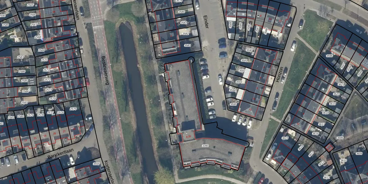 Het perceel waarop Einder 16 staat heeft een oppervlakte van 1291 m². Dit is een zeer groot perceel. De perceeloppervlakte wordt geregistreerd door het Kadaster. Gedetailleerde informatie over de maten van dit perceel kunt u vinden in het rapport Kadastrale kaart met maatvoering van Einder 16.