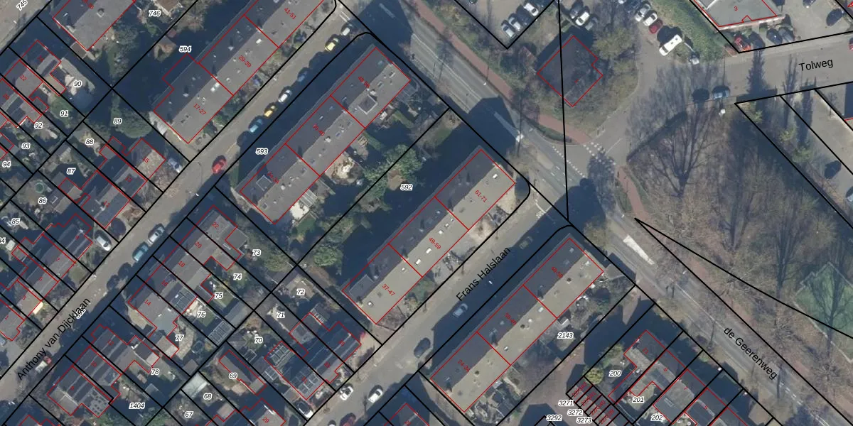 Het perceel waarop Frans Halslaan 59 staat heeft een oppervlakte van 1448 m². Dit is een zeer groot perceel. De perceeloppervlakte wordt geregistreerd door het Kadaster. Gedetailleerde informatie over de maten van dit perceel kunt u vinden in het rapport Kadastrale kaart met maatvoering van Frans Halslaan 59.