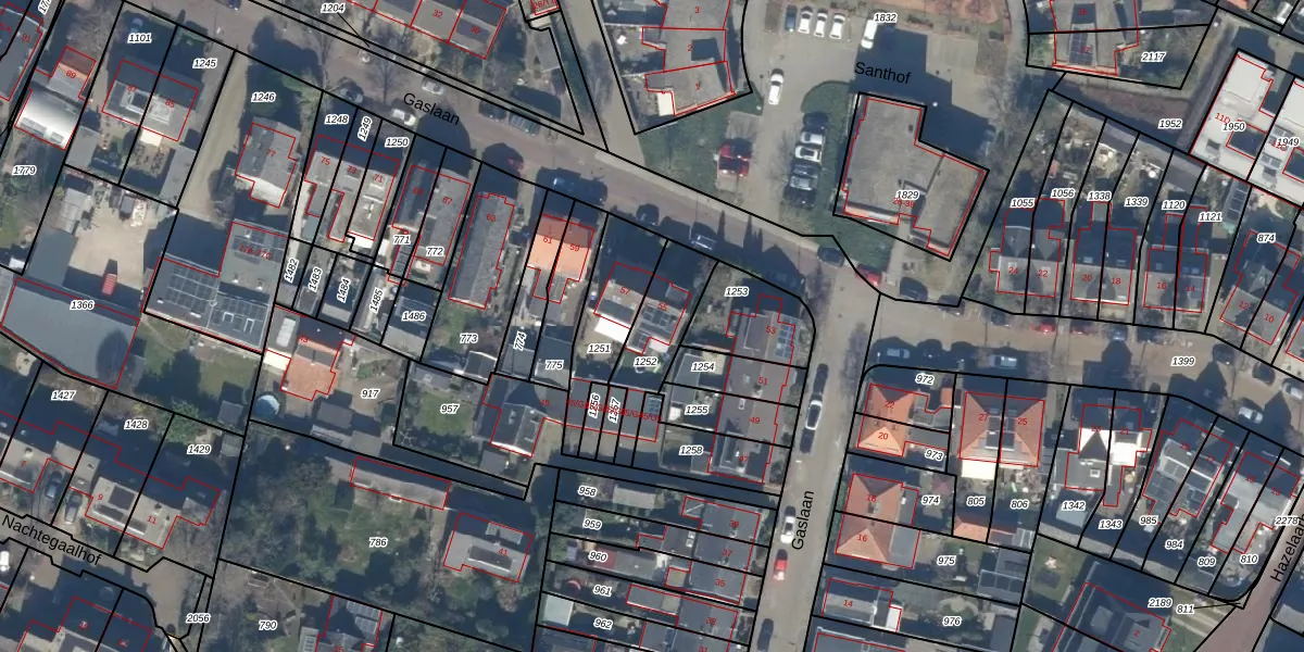 Het perceel waarop Gaslaan 55 staat heeft een oppervlakte van 215 m². Dit is een middelgroot perceel. De perceeloppervlakte wordt geregistreerd door het Kadaster. Gedetailleerde informatie over de maten van dit perceel kunt u vinden in het rapport Kadastrale kaart met maatvoering van Gaslaan 55.