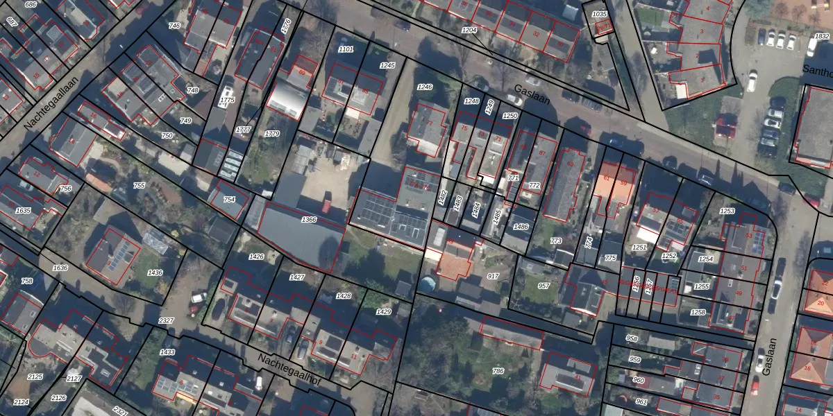 Het perceel waarop Gaslaan 77-A staat heeft een oppervlakte van 711 m². Dit is een groot perceel. De perceeloppervlakte wordt geregistreerd door het Kadaster. Gedetailleerde informatie over de maten van dit perceel kunt u vinden in het rapport Kadastrale kaart met maatvoering van Gaslaan 77-A.
