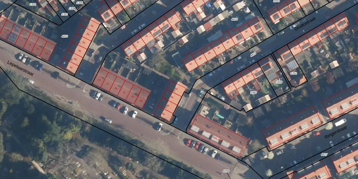 Het perceel waarop Gruttostraat 44 staat heeft een oppervlakte van 7400 m². Dit is een zeer groot perceel. De perceeloppervlakte wordt geregistreerd door het Kadaster. Gedetailleerde informatie over de maten van dit perceel kunt u vinden in het rapport Kadastrale kaart met maatvoering van Gruttostraat 44.
