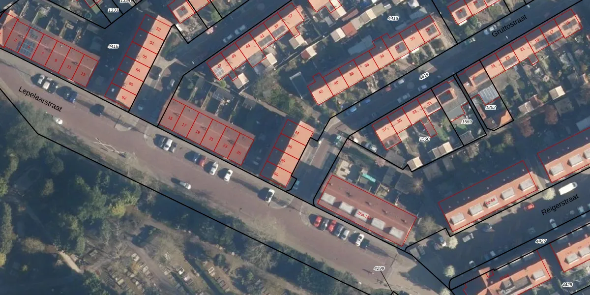 Het perceel waarop Gruttostraat 46 staat heeft een oppervlakte van 7400 m². Dit is een zeer groot perceel. De perceeloppervlakte wordt geregistreerd door het Kadaster. Gedetailleerde informatie over de maten van dit perceel kunt u vinden in het rapport Kadastrale kaart met maatvoering van Gruttostraat 46.